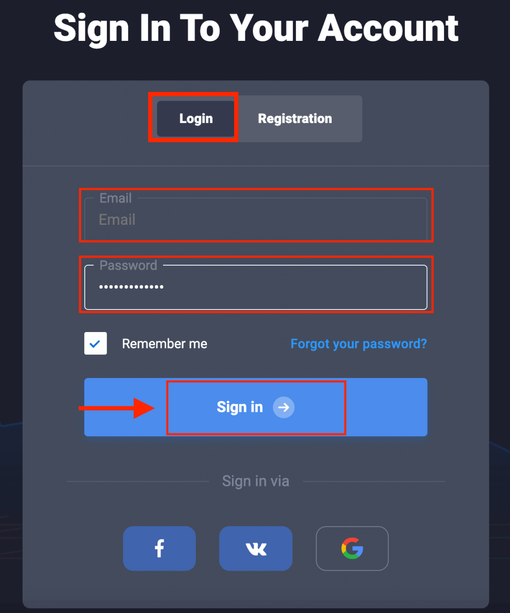 This will open the Quotex login page, enter your email address and password that is registered to log into your account, and click on the “Sign in” button.